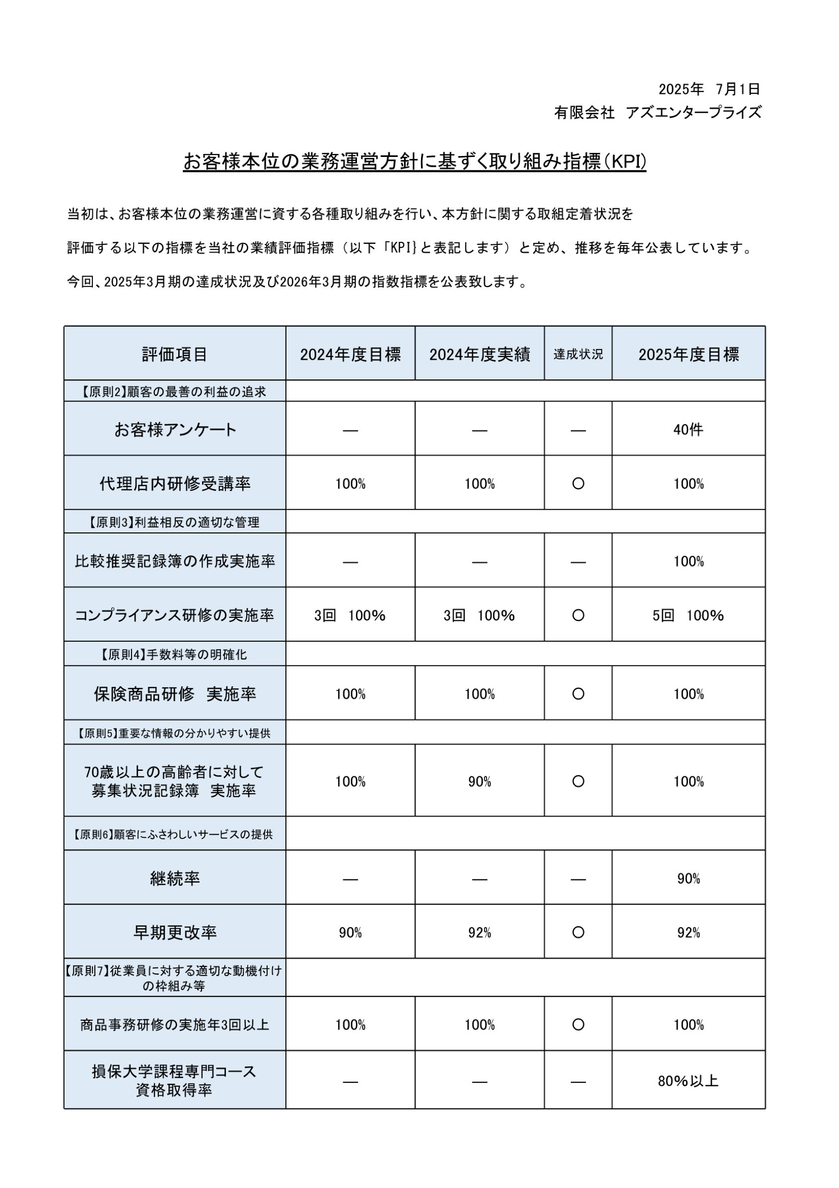 当社は、お客様から選ばれる代理店を目指し、「お客様本位の業務運営に関する方針」に則り、「お客様第一」の業務運営を徹底してまいります。